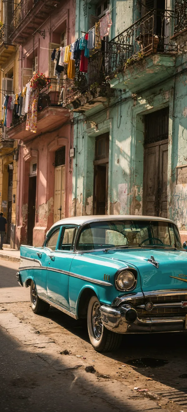 Classic turquoise 1957 Chevy Bel Air wallpaper featuring a stunning vintage car in vibrant Havana street scene with colonial architecture and warm Caribbean light.