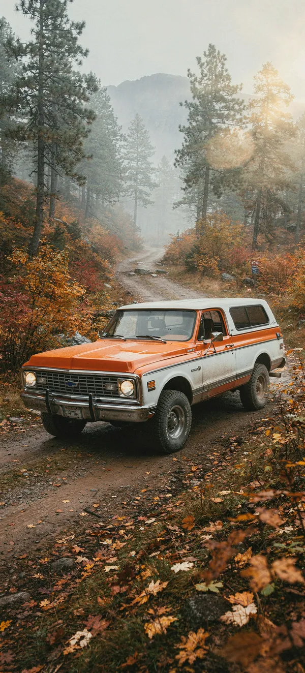CarsVintage orange and white Chevrolet Blazer K5 parked at scenic mountain trailhead with autumn colors and misty pine forest. Perfect HD phone background for classic car enthusiasts.