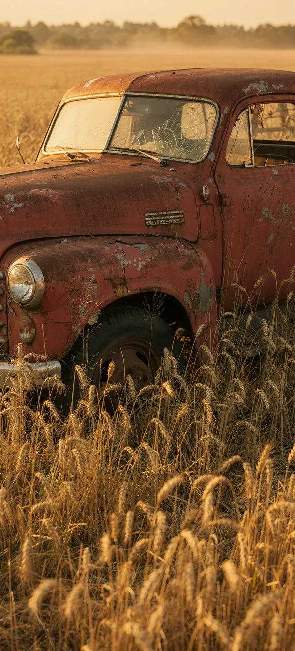 Stunning hyper-realistic phone wallpaper of an abandoned vintage red truck in golden wheat field with warm sunset lighting and detailed weathered textures.