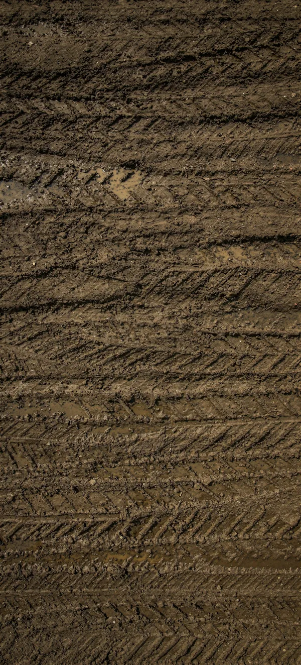 Stunning geometric tire track wallpaper with warm brown and sienna hues, showcasing intricate overlapping treads viewed from above with soft overcast lighting.