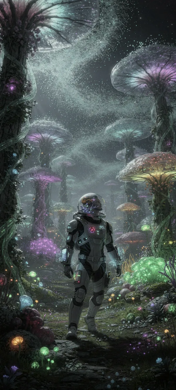 GamingImmersive sci-fi landscape wallpaper featuring luminescent alien forest with glowing pollen clouds and explorer in space suit. High-resolution 4K background.