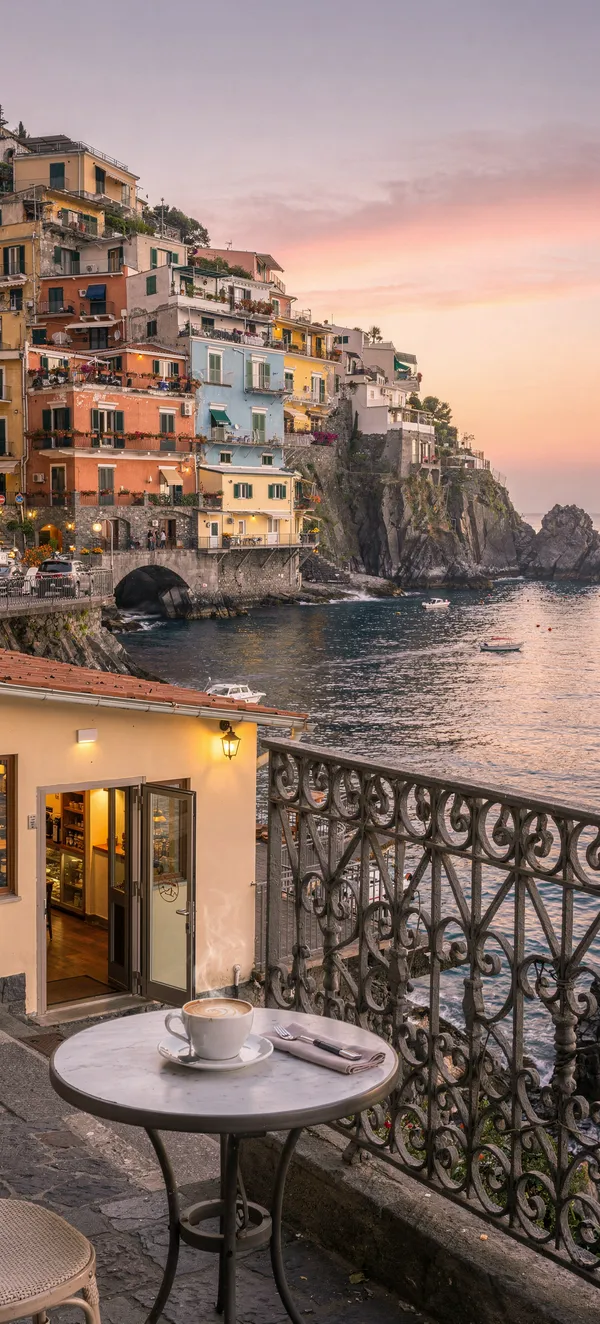 CityStunning HD wallpaper of Amalfi Coast at sunrise with colorful houses, Mediterranean Sea, and charming coffee shop scene perfect for mobile backgrounds.