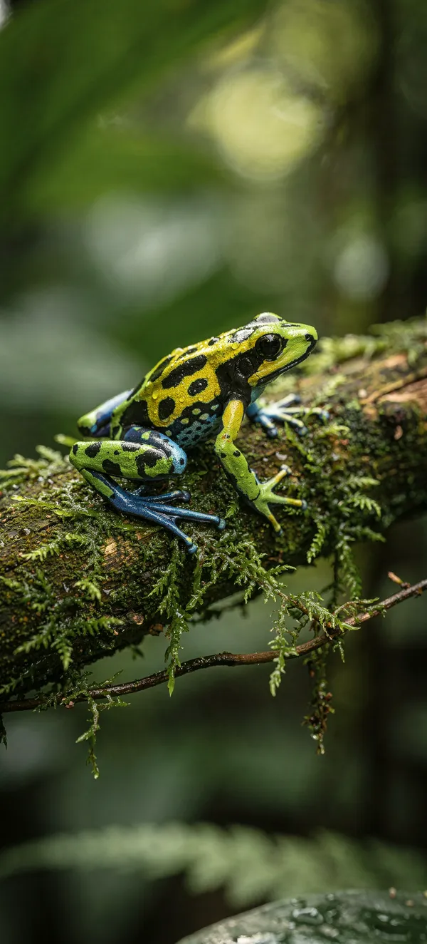 NatureStunning macro photo of a vibrant poison dart frog on moss, capturing rainforest details with crisp HD quality and vivid emerald green background.