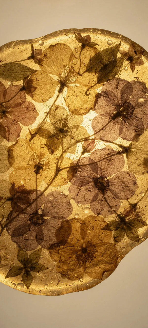 AbstractStunning translucent resin phone wallpaper featuring delicate dried flowers suspended in warm amber tones, creating a dreamy vintage botanical aesthetic in high resolution.