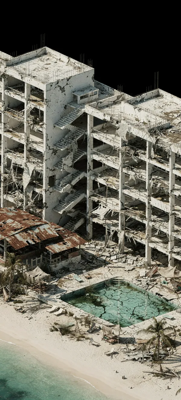 Dark / AMOLEDHigh-detail isometric dark wallpaper featuring abandoned tropical resort with stark geometric shadows, perfect for AMOLED and OLED phone screens with pitch-black background.