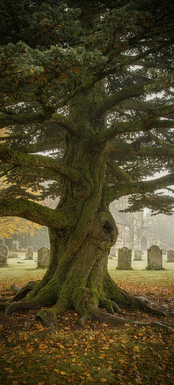 NatureHistoric English landscape wallpaper featuring a centuries-old yew tree with twisted bark, autumn leaves, and soft gray light. High-quality nature phone background.