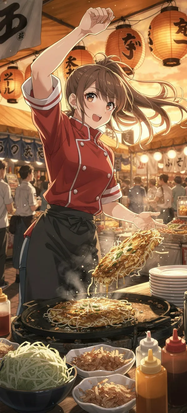 AnimeUltra-detailed anime culinary wallpaper featuring a dynamic female chef cooking okonomiyaki in a stunning Japanese street market sunset scene. High-quality mobile background.