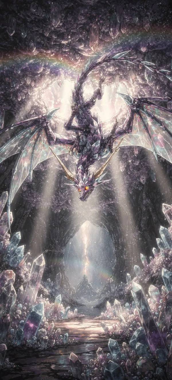 AnimeStunning anime fantasy wallpaper featuring a majestic crystal dragon perched in a prismatic geode cavern with amethyst and quartz formations. High-resolution design.