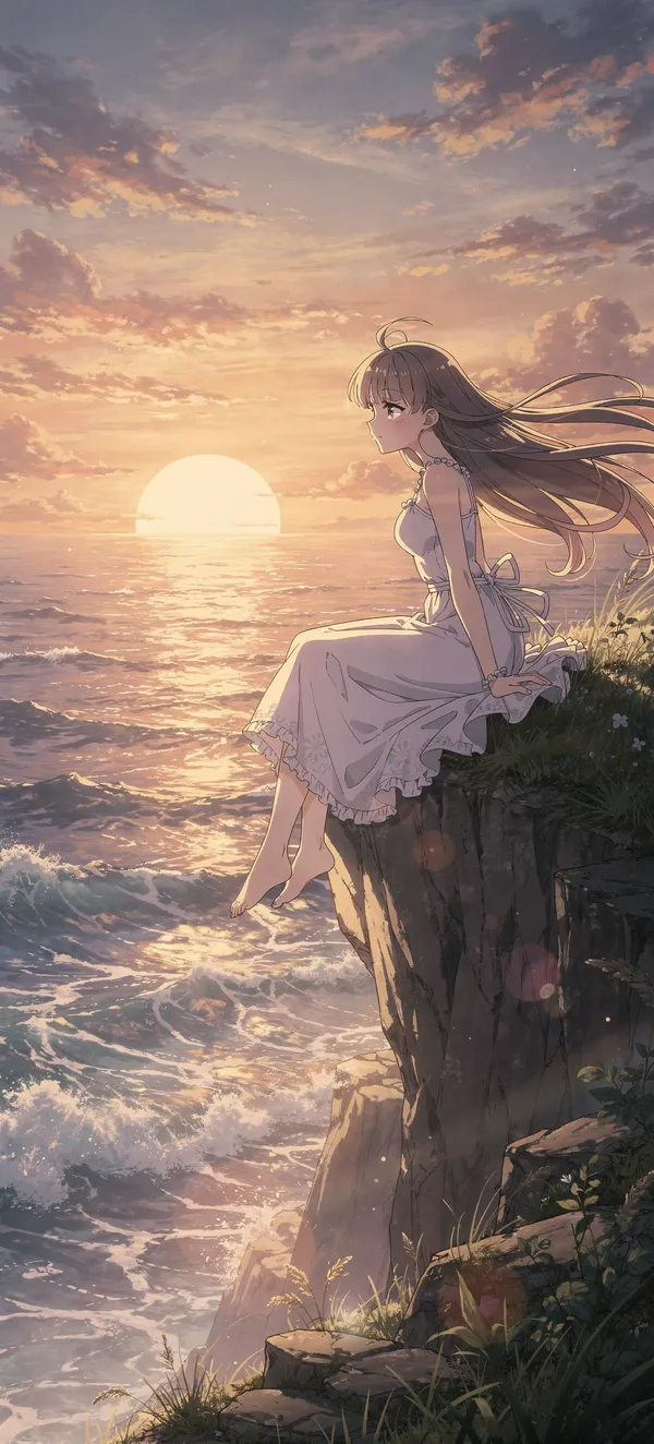 Stunning anime artwork featuring a beautiful girl in a flowing dress overlooking the ocean at sunset. High-quality anime phone background in vibrant HD resolution.