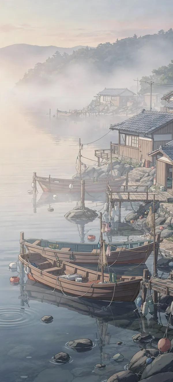 AnimeTranquil anime-style phone wallpaper featuring a misty morning in a peaceful fishing village with soft colors and atmospheric waterfront scene.