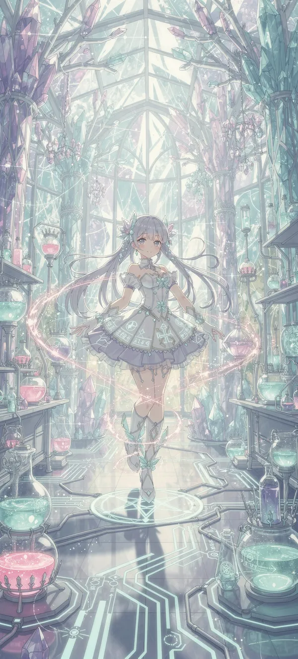 Stunning anime magical girl wallpaper featuring a vibrant crystal science fantasy scene with soft holographic lighting and intricate magical details. High-quality 4K design.