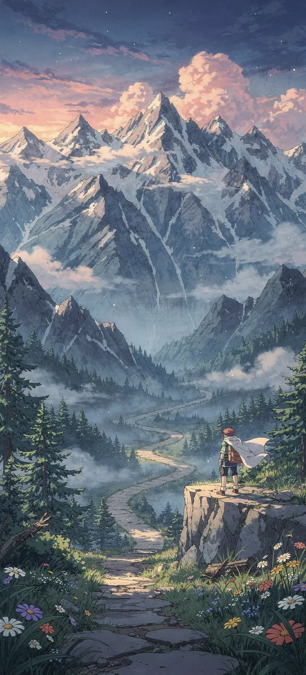 AnimeStunning anime landscape wallpaper featuring breathtaking mountain scenery. High-resolution 4K phone background with vibrant anime art style and scenic design.
