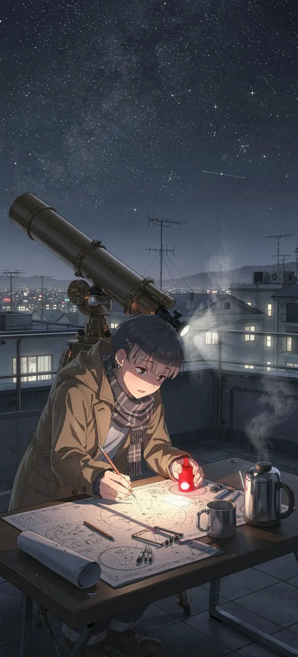 AnimeImmersive anime wallpaper featuring a passionate astronomer charting stars on a cold night, with detailed telescope and celestial scene in stunning HD quality.