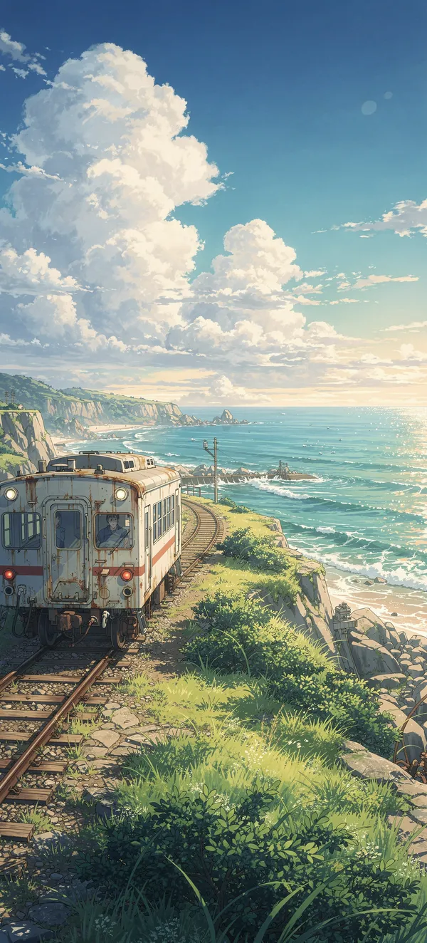 AnimeImmerse yourself in a beautiful anime landscape wallpaper featuring a vintage train traveling along a serene coastal scene with azure skies and soft white clouds.