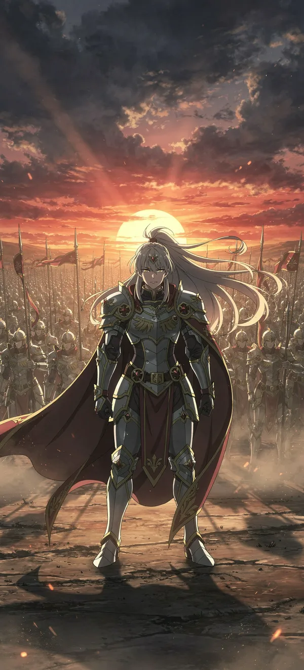 AnimeDramatic anime warrior queen wallpaper featuring a powerful silhouette against a stunning sunset battlefield scene with crimson and gold tones. High-resolution mobile background.