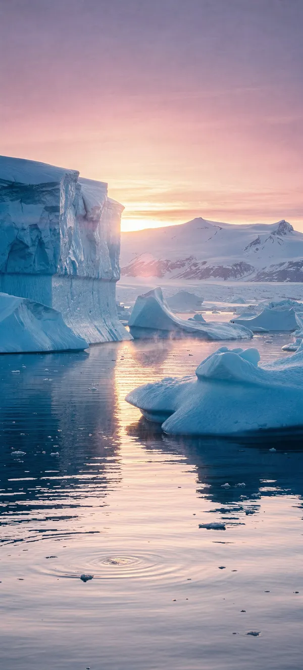 NatureUltra-crisp nature wallpaper featuring glowing blue icebergs, midnight sun, and mirror-like polar waters with lavender sky. High-resolution landscape photography.