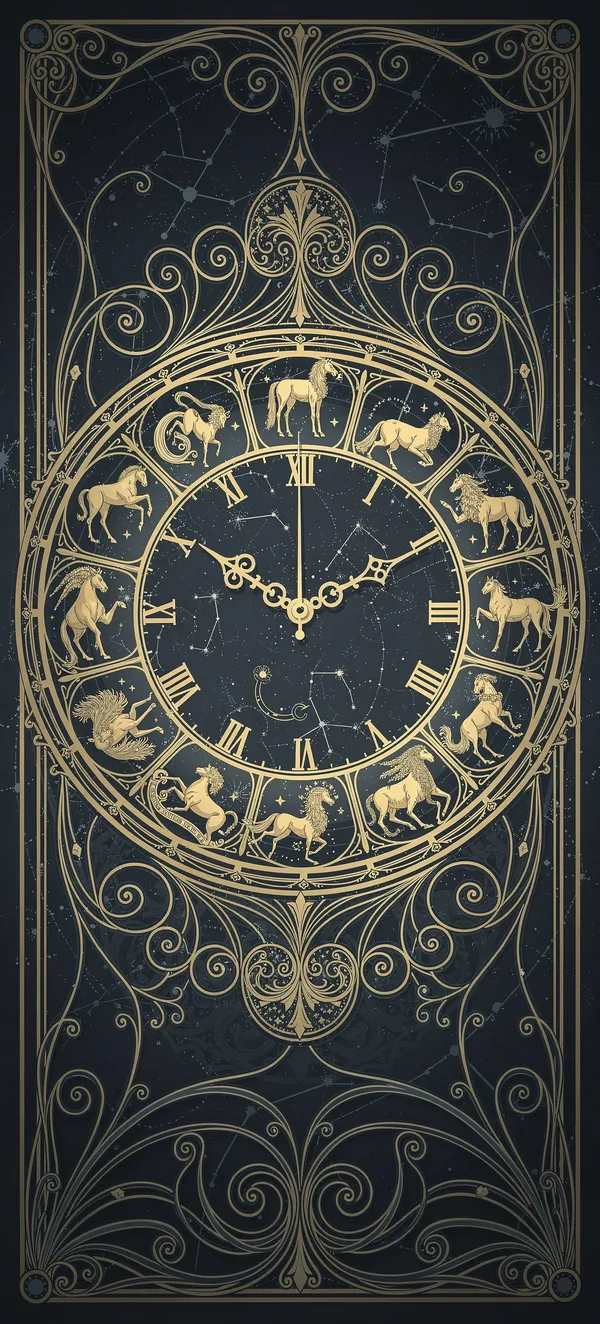ArtElegant midnight blue art nouveau wallpaper featuring intricate zodiac symbols, astronomical motifs, and golden Roman numerals in a stunning circular design for phone backgrounds.