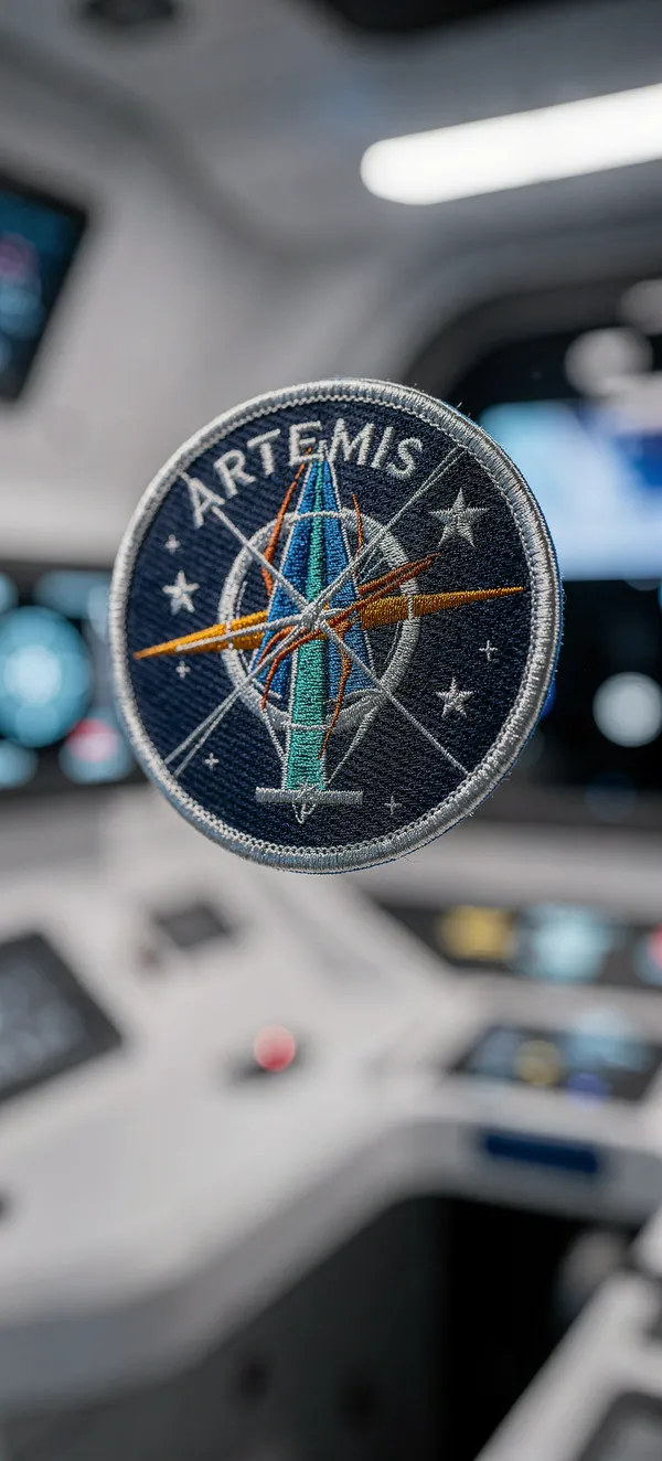 Explore stunning NASA Artemis II crew patch wallpaper in zero gravity with soft lighting and detailed embroidery texture. High-quality space mission background.