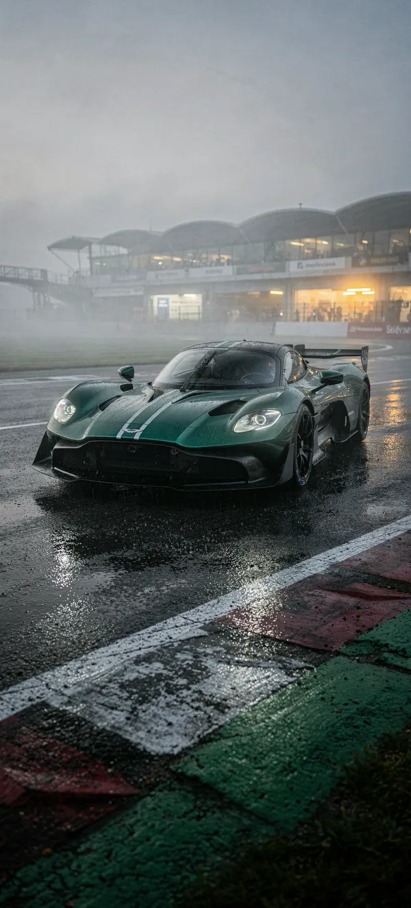 CarsUltra-detailed 4K phone wallpaper of a stunning Aston Martin Valkyrie in British Racing Green, capturing motorsport atmosphere at Silverstone circuit with morning fog.