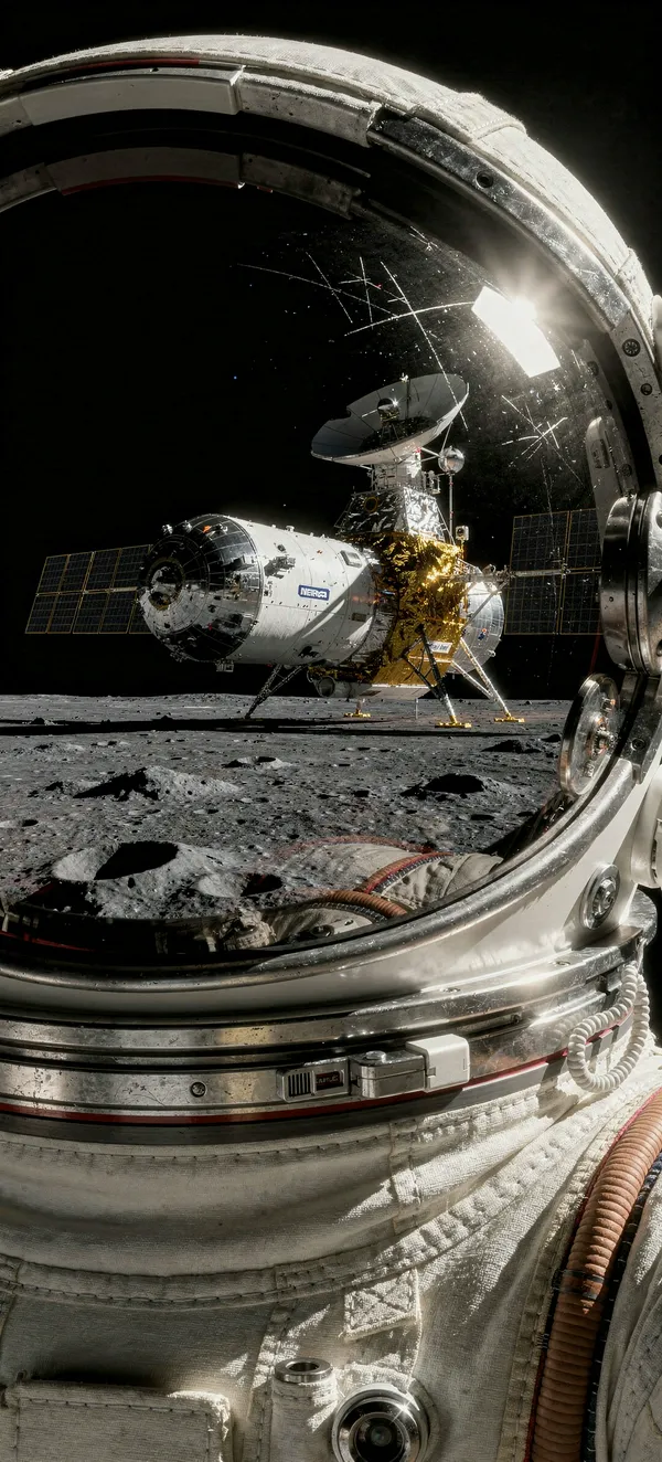 Ultra-detailed astronaut helmet wallpaper featuring a stunning Moon surface reflection and Orion spacecraft in crisp 4K resolution for space enthusiasts.