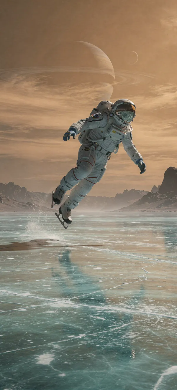 SpaceExplore a mesmerizing sci-fi scene of an astronaut ice skating on Titan's frozen methane lake with Saturn's silhouette, featuring stunning space and alien world details.