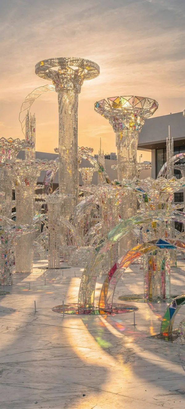 ArtStunning translucent glass sculpture landscape with golden light, intricate geometric forms casting prismatic shadows on minimalist white backdrop. High-quality artistic phone wallpaper.
