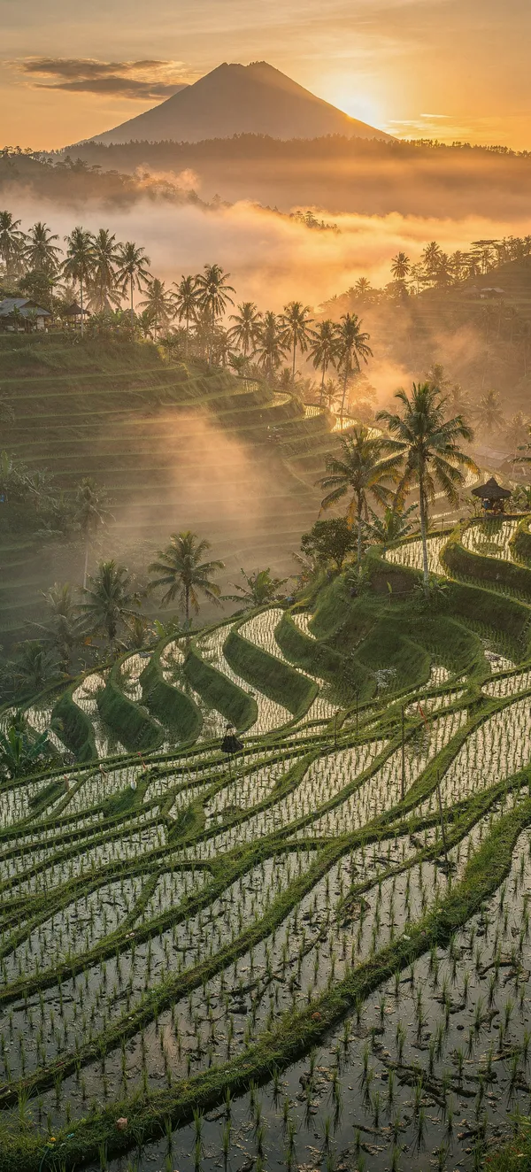Breathtaking tropical landscape wallpaper featuring golden sunrise over lush green Balinese rice terraces with misty volcanic hillsides and coconut palms.