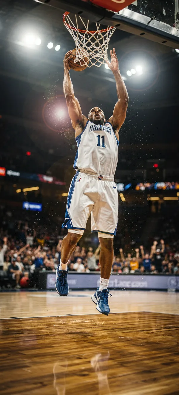 SportsHigh-intensity basketball action wallpaper featuring a dynamic athlete mid-slam dunk with dramatic arena lighting and blurred crowd background. Perfect HD mobile backdrop.