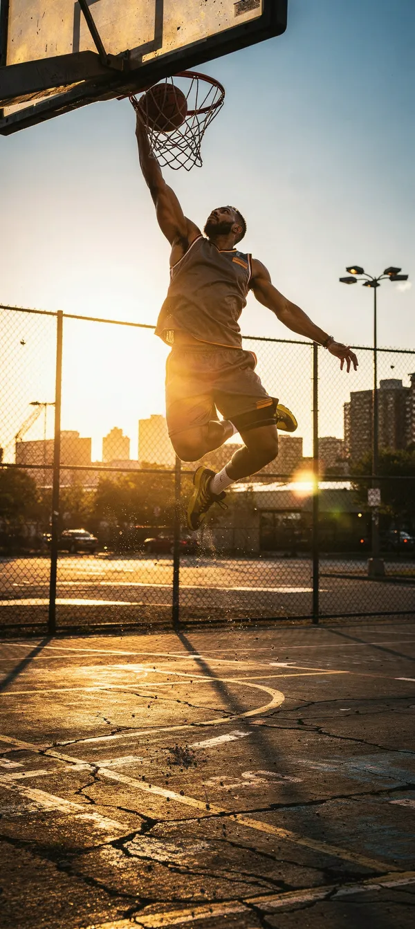 High-resolution dynamic basketball wallpaper featuring an epic slam dunk in golden hour light. Perfect HD sports background for mobile phones.