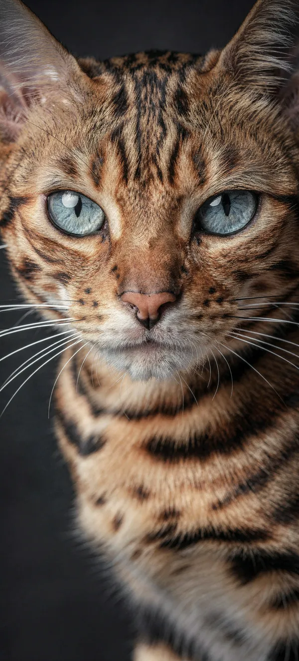 Stunning photorealistic Bengal cat wallpaper with mesmerizing blue eyes and leopard-spotted coat. High-quality 4K animal background for smartphone.