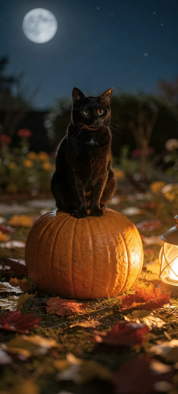 AnimalsEnchanting Halloween-inspired phone wallpaper featuring a black cat on a pumpkin under moonlight, perfect for seasonal mobile backgrounds in high resolution.