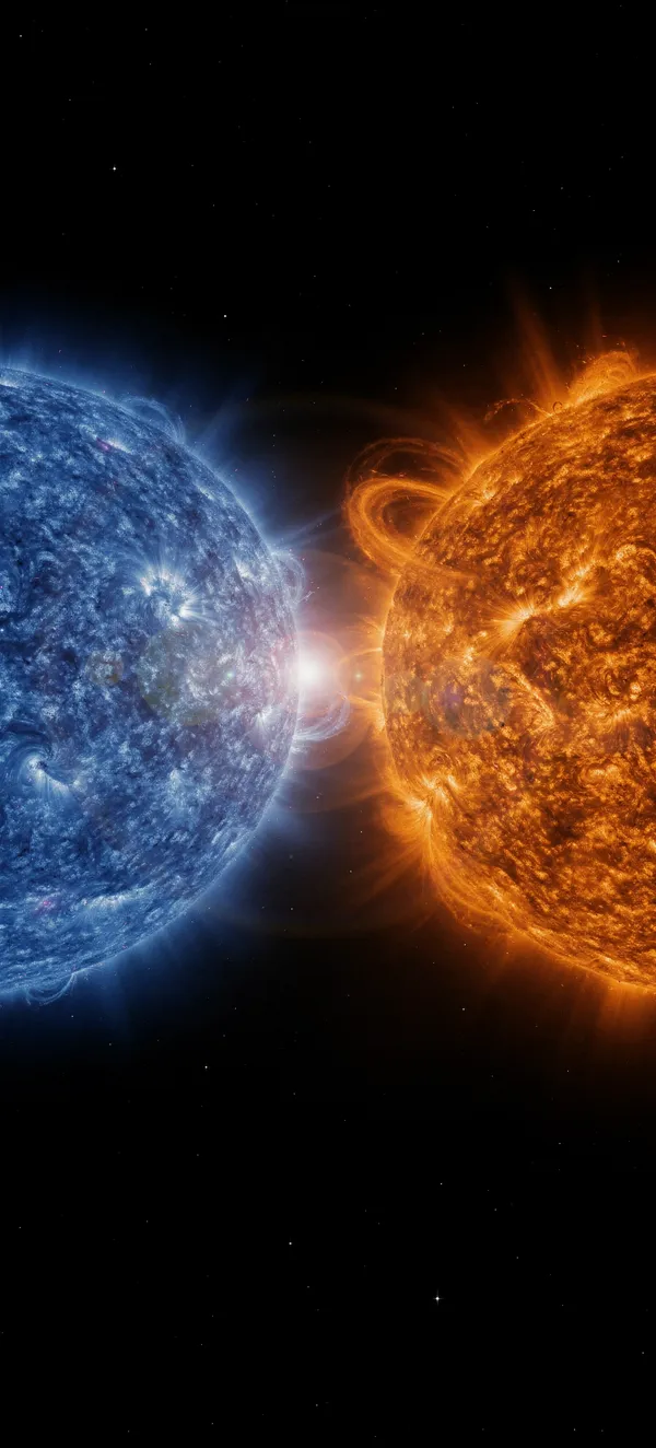 SpaceStunning photorealistic space wallpaper featuring vibrant blue and orange stars against a deep black cosmic background. High-quality 4K resolution for smartphones.