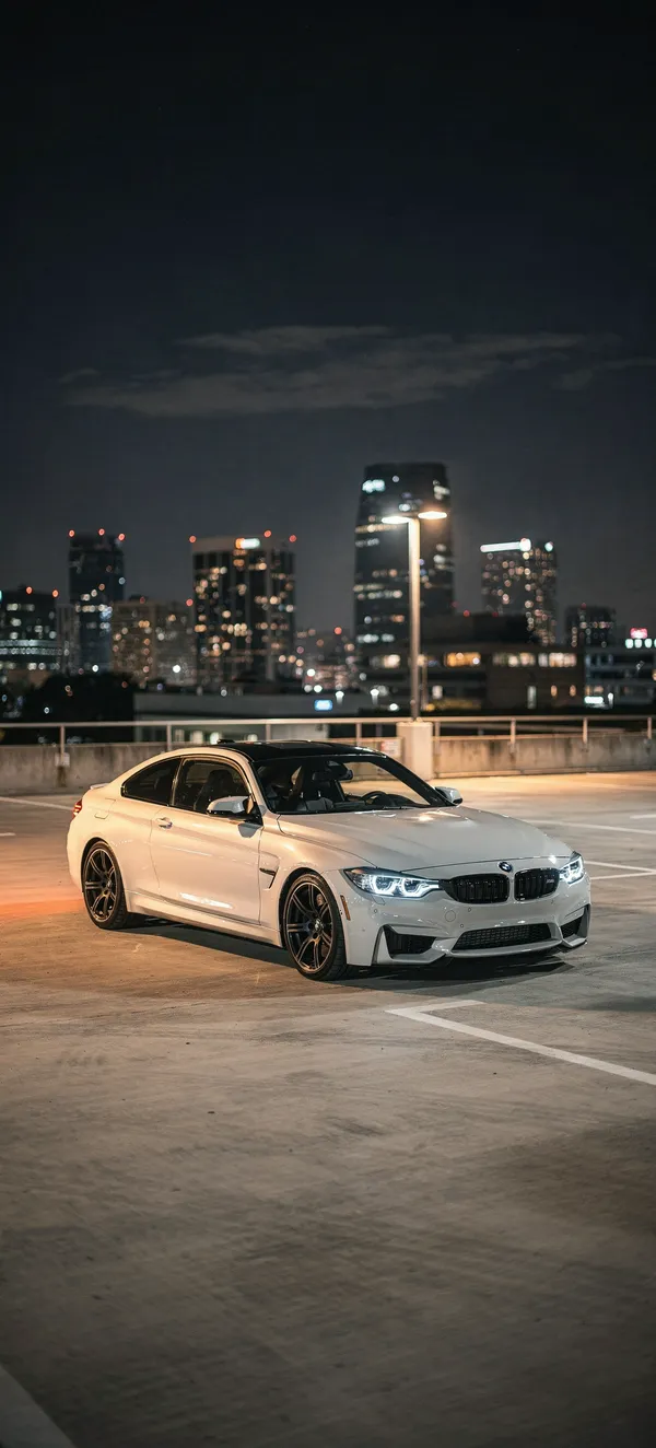 Stunning white BMW M4 against a nighttime city skyline. High-resolution automotive wallpaper with clean design and soft urban lighting for smartphone backgrounds.