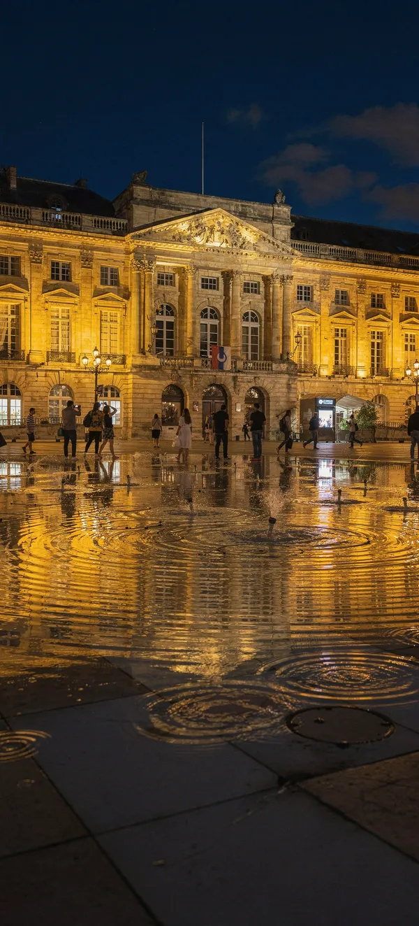 CityStunning Bordeaux cityscape featuring 18th-century architecture, Miroir d'eau reflection, and golden urban lighting. High-resolution night landscape wallpaper.