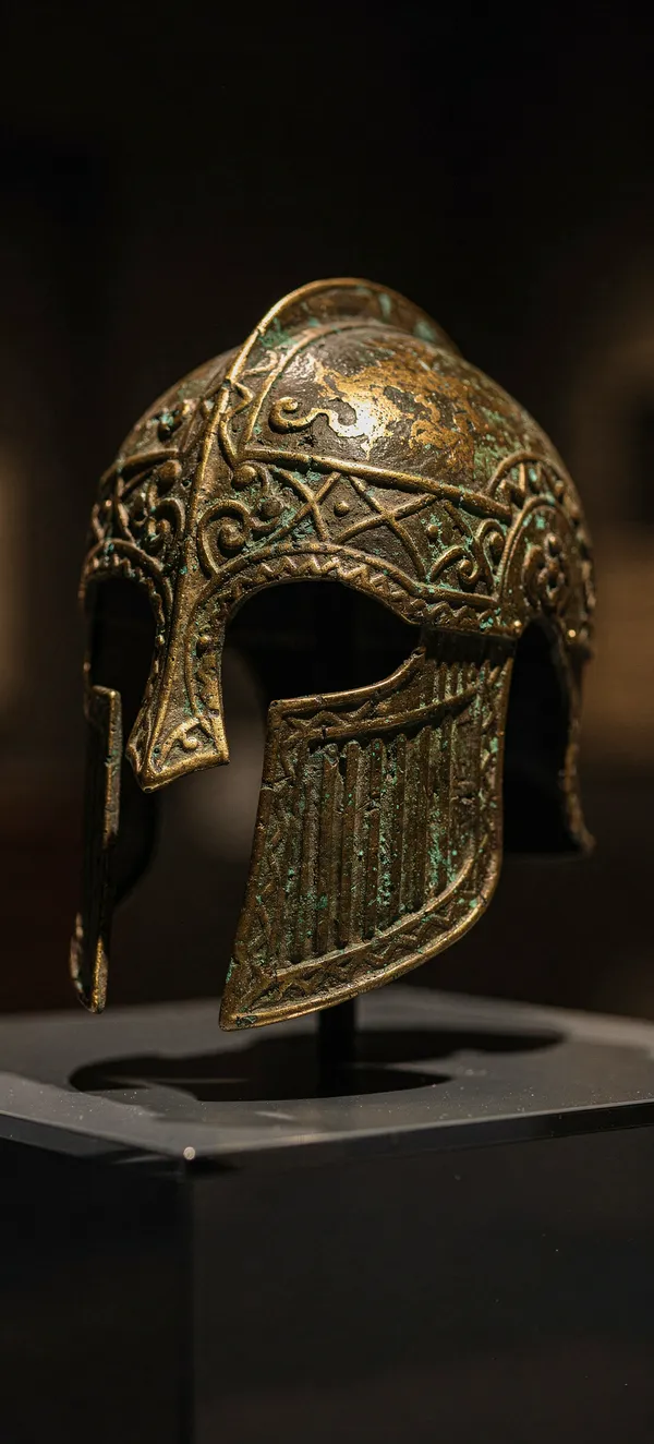 ArtHigh-resolution museum art wallpaper featuring a detailed bronze age warrior helmet with stunning verdigris patina and dramatic museum lighting.