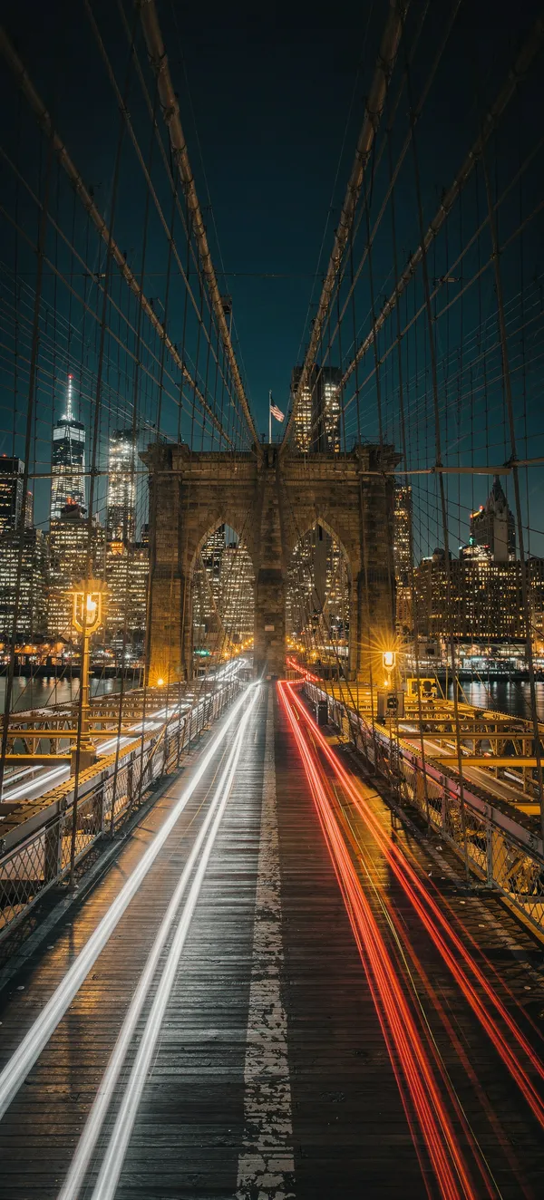 CityStunning long exposure cityscape wallpaper featuring Brooklyn Bridge at night with Manhattan skyline, light trails, and dramatic steel cable silhouettes in HD quality.