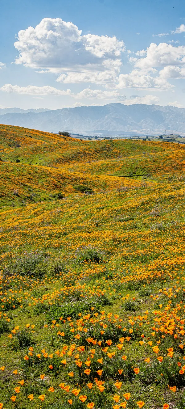 FlowersStunning high-resolution phone wallpaper featuring golden California poppies blanketing rolling hills with lush green grass and mountain backdrop. Perfect nature landscape.