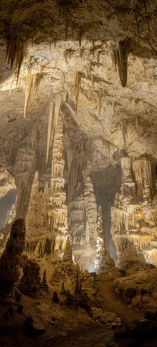 Stunning underground cave wallpaper featuring dramatic limestone formations with cool blue light, creating mesmerizing shadows and depth for your mobile screen.