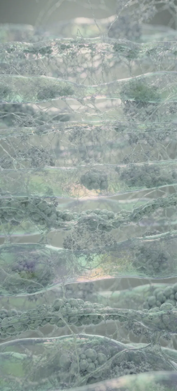 AbstractImmersive microscopic abstract wallpaper featuring intricate cellular structures in soft iridescent blues and greens, perfect for high-resolution smartphone backgrounds.