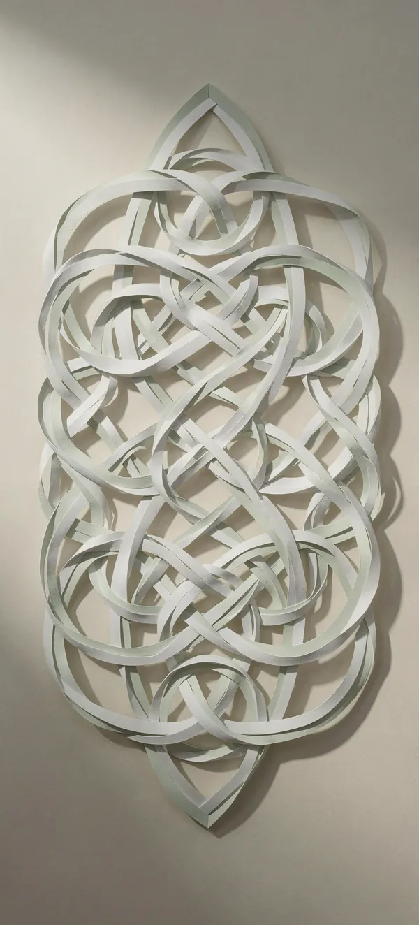 AbstractStunning hyper-realistic paper sculpture wallpaper featuring intricate Celtic knot design with soft shadows, geometric symmetry, and pale sage green tones in high-resolution detail.