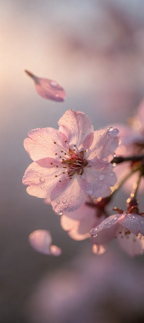 FlowersUltra-detailed macro cherry blossom wallpaper with soft morning light, delicate petals, and misty pastel background. High-resolution photorealistic floral design.