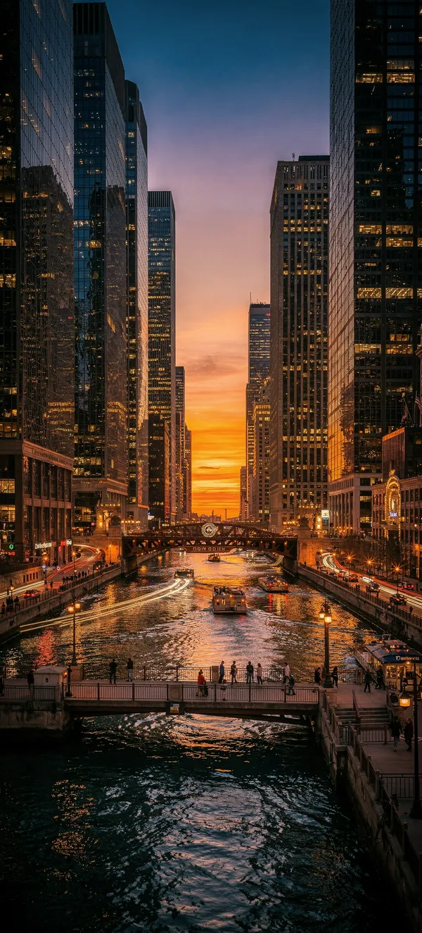 CityStunning Chicago Riverwalk cityscape wallpaper featuring golden sunset reflections, glass skyscrapers, and DuSable Bridge with vibrant urban landscape and dramatic sky.