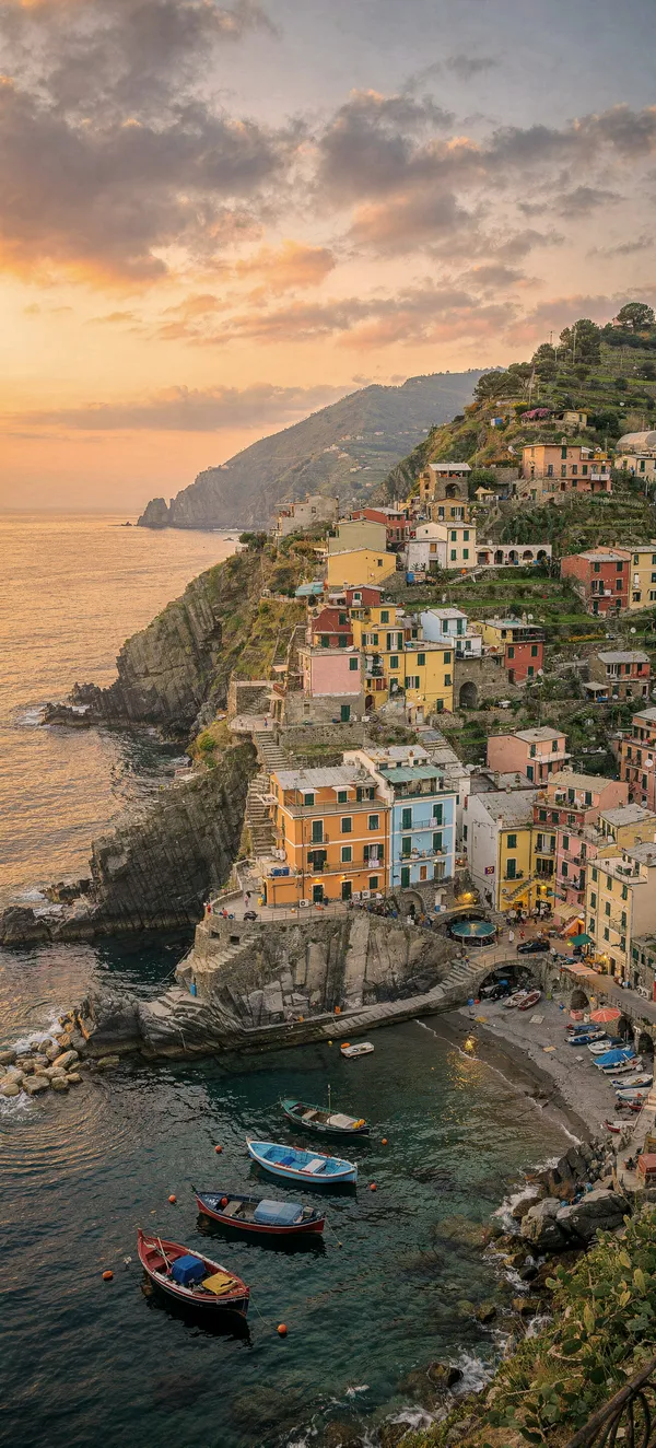 CityStunning Cinque Terre coastline at sunset wallpaper. Vibrant Mediterranean landscape with colorful villages and scenic Ligurian Sea views in high-resolution mobile background.