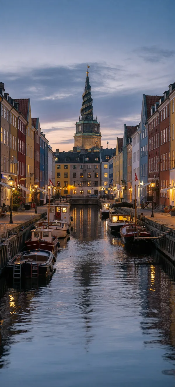 CityStunning Copenhagen cityscape wallpaper featuring Christianshavn's colorful buildings, Our Saviors Church, and serene canal waters at magical twilight hour.