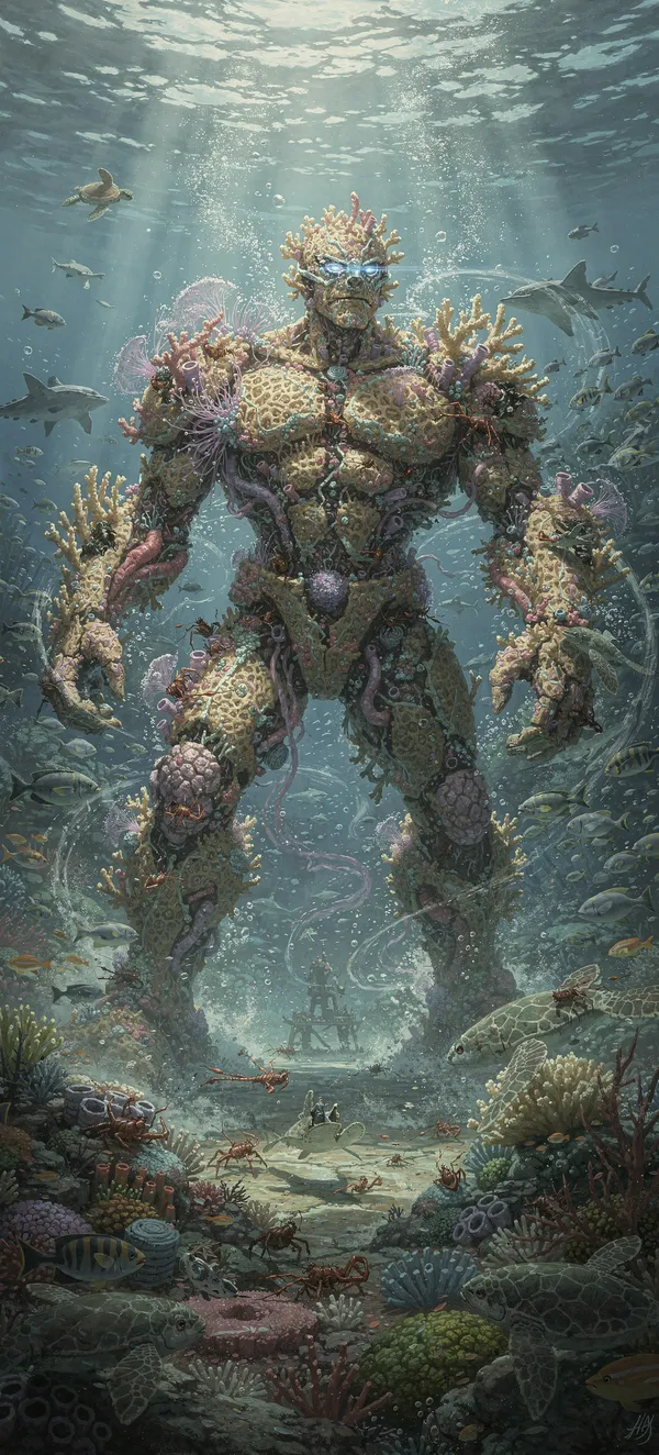 FantasyImmersive marine fantasy wallpaper featuring a massive coral golem protecting underwater ecosystem, detailed biological warrior design for mobile backgrounds.
