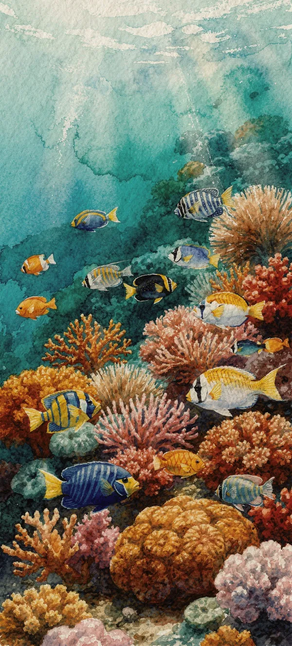 ArtImmerse your screen in a stunning watercolor coral reef with tropical fish. High-quality underwater art wallpaper featuring vivid turquoise, orange, and blue hues.