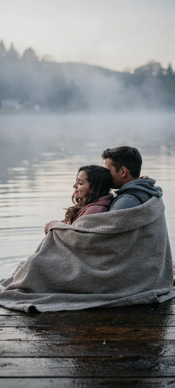 PeopleSerene romantic wallpaper featuring young lovers sharing an intimate moment on a foggy dock with soft morning light. High-quality, tender relationship aesthetic.