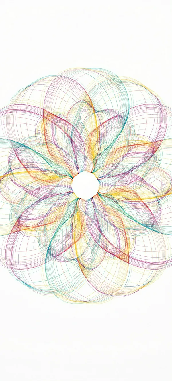 AbstractVibrant geometric spirograph wallpaper with translucent cyan, magenta, and yellow layers creating stunning color interference on a clean white background.