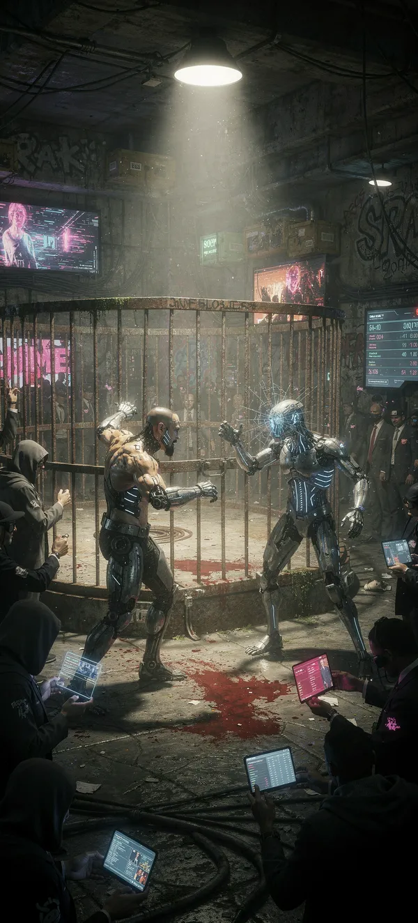GamingIntense underground cyberpunk battle scene with augmented fighters in a gritty urban slum. High-resolution mobile wallpaper for gaming and sci-fi fans.