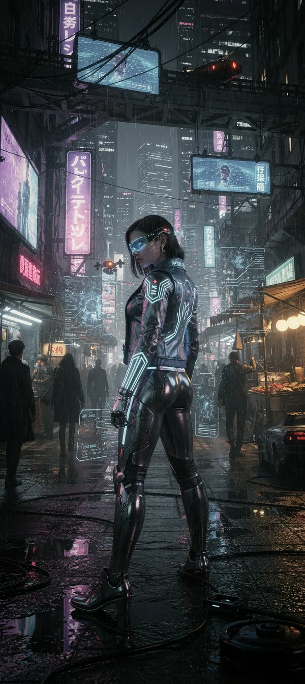 TrendingImmersive digital art wallpaper featuring a stunning cyberpunk Tokyo streetscape with holographic billboards and a chrome-clad protagonist in vivid neon colors.